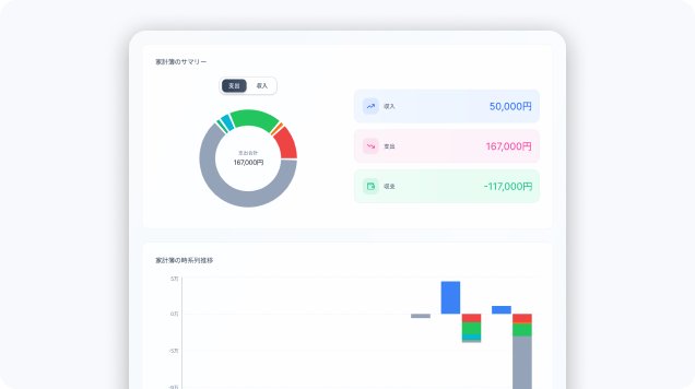 カテゴリ別の収支(食費・交通費など)と、銘柄単位の資産内訳です。「どこで何を買ったか」といった購入明細は連携されません。